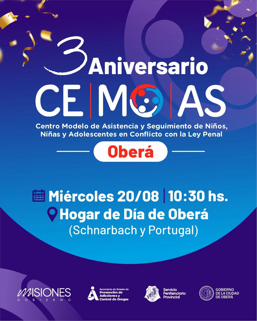 El miércoles 20 de agosto a las 10.30 horas se realizará una ceremonia en conmemoración del 3º aniversario del Centro Modelo de Asistencia y Seguimiento de Niños, Niñas y Adolescentes en conflicto con la Ley Penal.