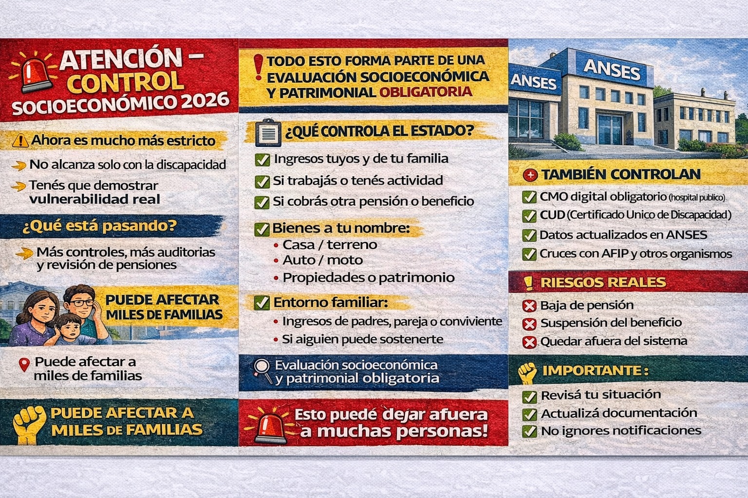 La consecuencia de no cumplir con estos parámetros o de ignorar las citaciones es directa: la suspensión inmediata o la baja definitiva de la pensión. Esta situación ha encendido las alarmas en miles de familias, ya que el criterio de "vulnerabilidad" puede ser interpretado de manera muy estricta, dejando fuera a personas que, si bien cuentan con algún bien básico (como una vivienda familiar o un vehículo antiguo para traslados), dependen exclusivamente del subsidio para costear tratamientos y necesidades básicas.